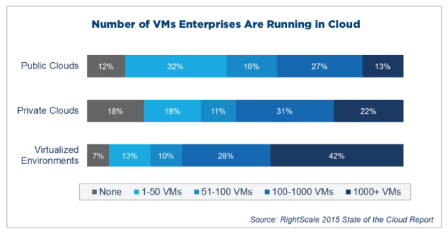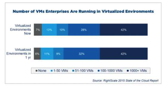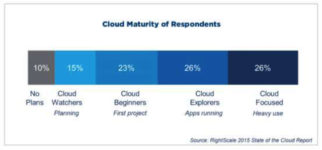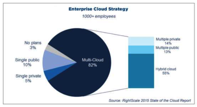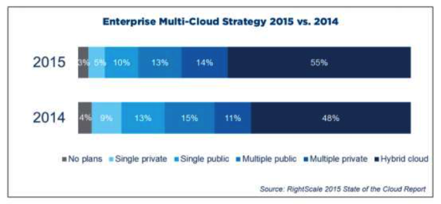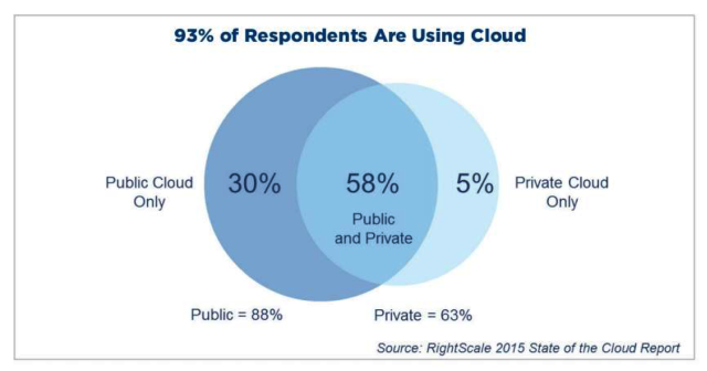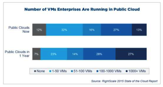 RightScale调查了930个来自不同行业和组织的专业人员,对他们关于采用云计算的观点作了汇总。调查报告的关键发现:Cloud是即成事实,并且混合云是一个用户首选的策,93%调查的组织已经在IaaS上运行应用或者正在评估IaaS,相对于2014年74%的比例,82%的企业已经有了混合云的策略;公有云的使用比例领先,但私有云承载了更多的应用,88%的组织正在使用公有云,而63%在使用私有云,13%的企业在公有云上运行了超过1000个VM,而22%的企业在私有云上云心过了超过1000个VM;企业向云端迁移还有更大的空间;企业的核心IT团队是云服务的关键力量;DevOps在上升,Docker开始起飞;AWS继续领跑公有云,Azure则在企业得到了不错的进展;2015年私有云的进展缓慢;