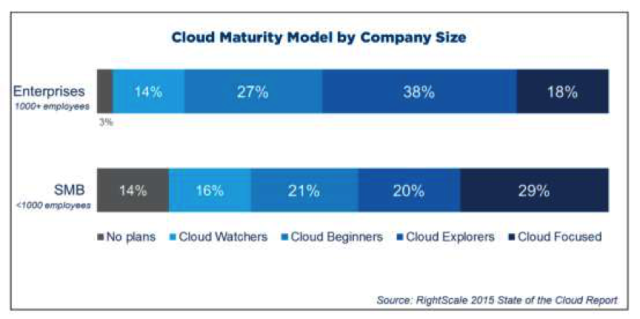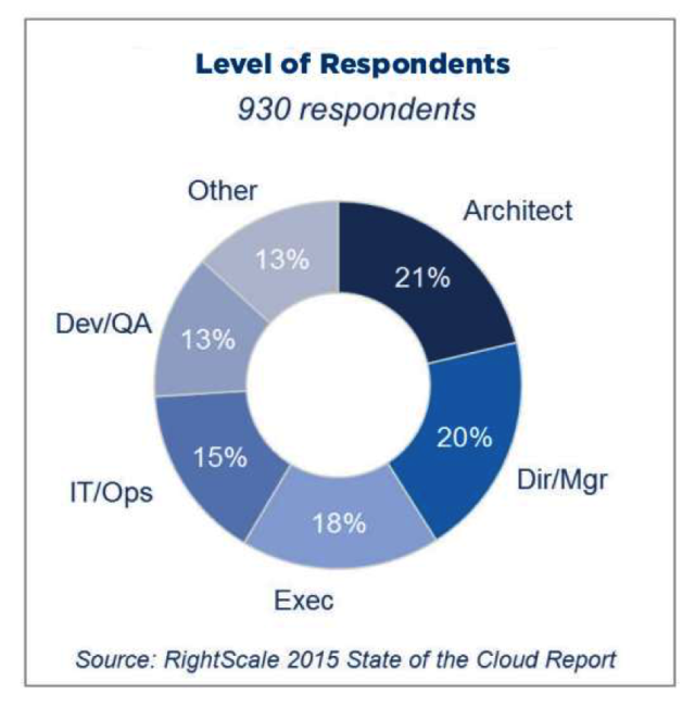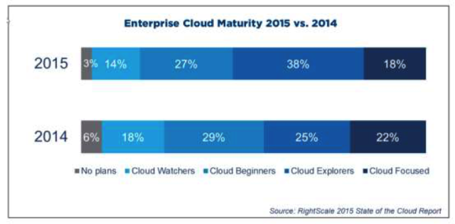 1 摘要 2015年1月,RightScale调查了930个来自不同行业和组织的专业人员,对他们关于采用云计算的观点作了汇总。2015年度云计算使用调查报告的关键发现有: Cloud是即成事实,并且混合云是一个用户首选的策略 93%调查的组织已经在IaaS上运行应用或者正在评估IaaS相对于2014年74%的比例,82%的企业已经有了混合云的策略 公有云的使用比例领先,但私有云承载了更多的应用 88%的组织正在使用公有云,而63%在使用私有云13%的企业在公有云上运行了超过1000个VM,而22%的企业在私有云上云心过了超过1000个VM; 企业向云端迁移还有更大的空间 68%的企业仅仅在云上运行不到1/5的应用;55%的企业证实很大部分关键业务并没有运行在云上,但是这些应用都已经采用了Cloud-Friendly的架构 企业的核心IT团队是云服务的关键力量 62%的企业证实他们的核心IT团队是做出云端采购决定的主要力量;43%的IT团队在提供一个自服务门户来提供对云端服务的访问,而41%的企业正在考虑开发一个门户; DevOps在上升;Docker开始起飞 66%的被访者已经采用了DevOps,而采用的企业达到了71%;Chef和Puppet的使用分别为28%和24%;Docker,在第一年,已经有13%的组织在使用,35%的组织在考虑使用; AWS继续领跑公有云,Azure则在企业得到了不错的进展 57%的被访者采用了AWS,而Azure比例从2014年的6%增长到12%;企业受访者中,相对于AWS的50%采用比例,有19%采用了Azure IaaS;紧接AWS和Azure之后,有10%的企业采用了vCloud Air(译者注:VMWare的混合云); 2015年私有云进展缓慢 VMWare vSphere继续领跑,有53%的企业受访者用其作为私有云;2015年企业使用OpenStack得到了3%的增长(已经是最大的增长了);Azure Pack在推出的第一年取得了11%企业的有力支持; 2 方法介绍 2015 年1月,RightScale进行了每年一度的云计算使用情况的调查。调查对象涵盖了不同领域的组织的专业人员,对他们采用云基础架构的情况进行了调查。 930个受访者级别从技术主管、经理到实践者,代表的组织也涵盖了不同的规模以及不同的行业。受访者代表的公司来自不同的云领域,包括 RightScale的用户(24%)和非用户(76%)。他们的回答为当前云的使用状况提供了详尽的信息。 关键的统计数据: 被访者的数量:930企业被访者:306SMB被访者:624误差范围:3.2% 3 云成熟模型在这个报告中,RightScale在分析组织对云使用情况上,使用了它的“云成熟模型”的细分方法。“云成熟模型”把云的成熟度分成了四个阶段。从组织采用云的最少程度到最高程度,这四个阶段分别是: 云的观望者:指的是正在制定云策略的组织,但是还并没有在云上部署任何应用。云的观望者希望评估不同的云的选项,来决定什么应用可以在云上实现。云的入门者:指的是已经在开展 POC 或初步的云的项目的组织。这类用户希望在云上获得更多经验来决定未来的项目。云的开拓者:指的是已经有很多项目或者应用在云上部署了。云的开拓者专注于提高和扩展他们对云资源的云的专注者:指的是很大程度上仰仗云基础设施,并且希望提高云的运营效率和降低云的成本。 本报告的调查对象包含了全部四个阶段的组织,比例如下 4 关键的发现4.1 云是一个既定事实,并且混合云是首选的策略在上一个云使用调查报告之后的12个月,对云的使用持续增长,93%的受访者证实他们在使用云。88%的受访者使用了公有云,63%的使用了私有云,58%两者都有。 当比较大公司和小公司对云的使用情况时,很有意思的是大企业受访者很大程度集中在了“云的入门者”和“云的开拓者”上。在去年一年时间,有很多的企业进入了“云的开拓者”的行列,“云的开拓者”比例从 2014 年的 25%上升到 2015 年的 38%。 大的组织正努力向着云前进,只有3%的大企业受访者希望仍然停留在“云的观望者” 阵营。 有意思的还有,大企业希望使用多个云,82%的受访者希望支持多云策略,而 2014年这个比率只有74%。今年的调查发现,55%的大企业正在计划实施混合云,13%希望使用多个公有云,而 14%则希望使用多个私有云。 4.2 企业更广泛的采用公有云;更深入的采用私有云。虽 然公有云的使用在数量上保持了领衔,私有云却在使用程度上占了优势。只有 13%的大企业受访者在公有云上运行了超过 1000 个 VM,但是却有22%在私有云上运行了超过1000 个VM。对比起来,大企业通常都有长期运行的虚拟化环境,42%提供了1000 个 VM或者更多。在使用程度上保持领先的私有云,代表了现有的虚拟环境已经被增强或者重新标 注成私有云。 但 是,当我们朝前看的时候,大企业正期望增加他们在公有云上的使用程度。在 12个月内,27%的大企业受访者希望在公有云上运行超过 1000 个 VM,远超过了现在的 13%。私 有云的使用程度也会增长,31%的受访者期望使用1000个或者更多的VM在私有云上,而 这一比例2014年是22%。经过这一年的观察,我们发现大企业正在均分他们在公有云和私 有云上的使用程度,而非云的虚拟环境却保持不变。 4.3 更多企业应用向云端迁移的巨大空间虽然云的采用速度增长很快,但是企业仍然只是在云上运行一小部分应用。大多数(64%)受访者证实,他们只有不到 20%的应用跑在云上。 但是,他们同样证实了将更多的应用迁移到云端的更大空间。大多数(55%)受访者证 实至少有 20%的应用是构建在 Cloud Friendly 架构上的,以便于迁移到云上。