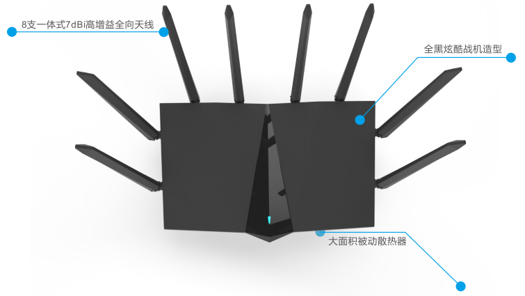 如果你以为G7拼的只是内涵,那么你大错特错了。战机造型的G7,采用全黑炫酷设计,即便不是用做路由器,摆放在家里,也是一款精美的工艺品。G7内部还采用了黑油PCB,增加主板稳定性;网络接口全部采用全金属屏蔽8芯网口,保障数据稳定传输;采用一体成型大面积被动散热器,即便如今夏40℃酷暑高温天,也能良好散热保证路由器长期稳定静音运行。G7的高标准工业设计和制造工艺,铸就了其内外兼修的精致品质。