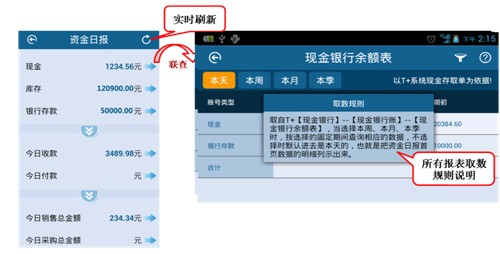 方便,实时报表联查 所有的报表都实时从T+取数,并可联查明细。畅捷移动T+11.5SP2全新设计了报表查询机制,在现有报表体系上把每天一次的批量更新改为了实时更新机制,并不减少原有响应时间,还有提高查询效率。 全新报表支持日报、排行榜、报表中心数据图形与列表方式展现,并支持数据联查穿透分析功能,从以往的静态数据提供转为动态分析参考,为企业提供实时详细的数据分析。