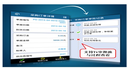 高效,支持T+审批流 畅捷移动手机端支持T+ 审批流审批功能,与T+一样支持单据审批流功能。手机移动端新增费用单、收入单据审批支持,优化重构了现有支持单据的格式展现,增加审批过程查看与明细列表查询。