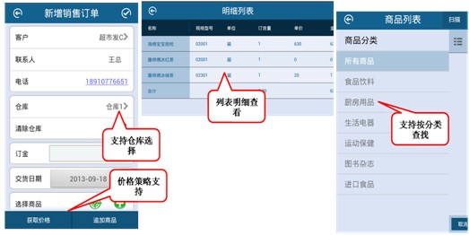 强大,销售订单全搞定 支持手机订单、多计量单位、订单交互和价格策略等。畅捷移动T+11.5SP2支持手机端订单单据复制、暂存、赠品处理功能、优化了网络不稳定超时自动连接。支持手机端下销售订单多单位选择,优化重构了现有订单商品批选择、仓库选择(仓库也可为空)、负库存检验控制。此外,手机端支持与T+后台一样获取客户价格策略,并自动生成修改前与修改后价格参考,支持商品按分类、条形码、助记码、规格型号查询匹配。