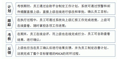 绩效管理信息系统的目标是让绩效管理真正在企业中“动起来”,全员参与、过程互动。正是绩效管理信息系统为直线经理和员工的职责及管理行为提供了具体的操作平台,并大幅度降低了管理成本,提高了管理效率,提升了管理便捷性,才能够达到让绩效管理“动起来”的目标。绩效管理理念、方法、职责再转化为流程、表单固化到信息系统之中,这样员工和直线经理就可以按照系统流程设置依次完成“计划、跟踪、评估、反馈”的PDCA过程。