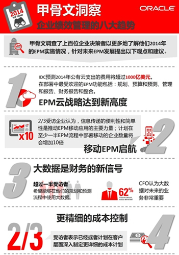 甲骨文调查了上百位企业决策者以更多地了解他们2014年的EPM实施情况,这些被访者来自甲骨文客户群及业界其他企业,他们针对过去、现在和未来的EPM技术和实践提供了很多具体的反馈。
