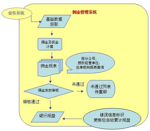 项目背景: 安邦财产有限公司是一家全国性的公司,目前已在全国37个省、市、自治区及重点城市设立分公司,600多家授权经营单位,超过1万人的业务人员。由于保险行业业务人员的特点,同时也由于安邦的业务需要,使业务员薪酬计算复杂。为了业务员薪酬发放的规范化,科学化,同时为了配合公司新颁布一系列政策的推行,安邦于2006年年底提出以ASP模式招标业务员的佣金系统,并要求投标商承诺系统能于2007年1月1日成功上线。 基于安邦业务员薪酬(即保单佣金)发放形式的复杂性,市场上现有的标准软件都不能足以满足,需要另行开发,而在如此短的时间内进行开发,并保证万人系统成功上线对于任何一家软件提供商来说都是一项艰巨的任务,而对安邦来说如何在众多服务商中选择可信赖的合作伙伴也是一项有风险的挑战。 针对此项目,安邦特成立一个项目小组,经过几轮的系统演示、标书审定、技术沟通、商务谈判等环节的慎重考察,万古凭借优秀的产品、专业的技术力量、良好的口碑及多年来为客户提供信息化服务的丰富经验一举中标,最终赢得安邦的信赖。 系统流程图:
