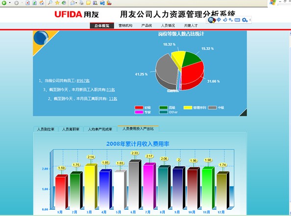 用友eHR5.5 支持多数据源和多种数据库类型,支持任务调度(可以用来定时刷新报表数据,优化报表展现速度),可以分析指标历史、当前状况并预测未来指标走势。实时监测的指标如下: