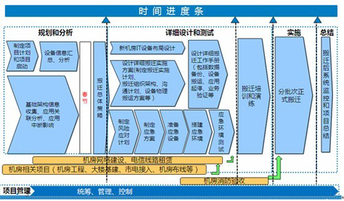 详细设计阶段是在完成迁移整合策略后,以迁移整合策略为指导,制定迁移整合实施过程中涉及到的各个流程。比如设备清点,机房布局设计,迁移整合过程细化设计等。实施阶段主要是培训和演练,以及迁移整合实施。