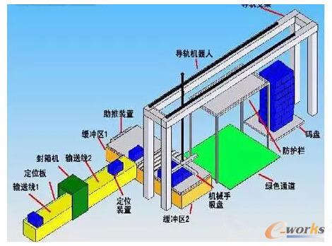 22台封箱机经输送链与码盘机器人接头,输送链在码垛钱江带产品的纸箱提升至离地面2米处。纸箱由码盘机器人按货架层间距的尺寸要求,整齐地码放在下游输送带上的托盘上。