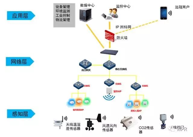物联网是互联网的应用拓展,与其说物联网是网络,不如说物联网是业务和应用。因此,应用创新是物联网发展的核心,以用户体验为核心的创新是物联网发展的灵魂。 以下图为例,物联网大致分为以下几个层级:感知层,网络层,应用层。 感知层相当于人的感官和神经末梢,用来感知和采集应用环境中的各种数据。包括温度、湿度、速度、位置、震动、压力、流量、气体等各种各样的传感器。灵敏度和精度高,功耗低,可以无线传输是对传感层的要求。 网络层相当于人的神经系统,用来传输数据。包括各种各样的无线通讯技术和标准,比如Zigbee/BLE/Wifi/NFC/RFID /LTE等。低功耗,广域覆盖,更多连接是无线网络的发展方向。目前新的通讯技术和标准NB-IoT,LoRa,eLTE-IoT都是往这个方向努力。未来的5G会取代目前很多的无线通讯技术,一统江湖。 应用层相当于人的大脑指示和反应,通过指令反向控制输出。如设备管理,环境监测,工业控制等。