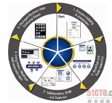 你不能在真空中实施BPM。把你的系统和遗留的应用程序整合在一起,聚合和组合应用程序,在云中组合成Web服务,这些都十分重要。使用基于云的BPM,可以帮助你调整各种企业IT的投资。在云中建立一个BPCC(business process competency center)可以帮助你重用流程的资产和公共的管理模型。