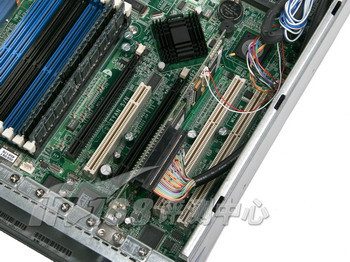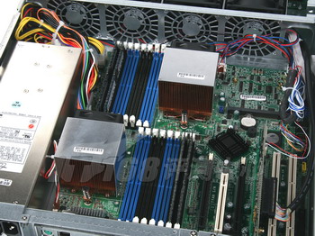 打开曙光A620r-F服务器的上盖可以看到系统风扇是4个平均转速在5000RPM左右的8cm风扇,它们产生的气流会依次经过处理器、内存模组、PCI扩展卡,然后离开服务器。两颗AMD Opteron 2000系列处理器均采用了主动式散热器,以进一步确保处理器稳定工作。这次送测正式机型同之前我们所测试的样品的散热解决方案均是相同的,甚至是芯片组的散热片也是相同的。