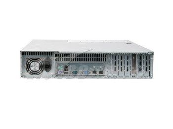 从服务器的后部看到,送测样机采用了单电源供电,提供了PS/2键盘和鼠标接口、1个百兆以太网接口(RJ45)、2个USB接口、2个千兆以太网接口(RJ45)、1个串口(9pin)和1个VGA接口(15pin)。另外,还预留了7个PCI设备的扩展位置--其中一个扩展位已经被RAID卡占用。