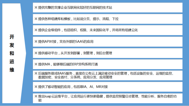 用友网络科技股份有限公司云平台服务部副总经理罗小江 用友云平台帮助企业解决开发效率和研发成本问题、企业级应用特性问题、混合云和应用生态的纠结。那么,iuap到底能做哪些事情?罗小江分别从开发运维和集成场景进行分析。