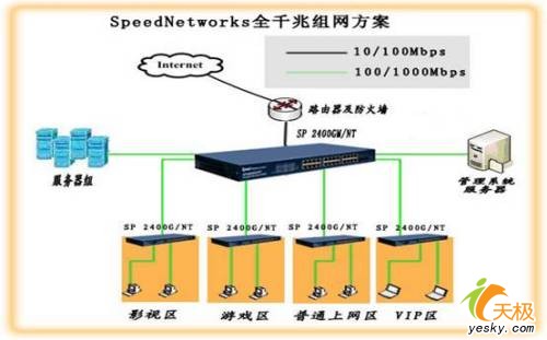 在这里笔者向众网吧业主推荐一款:时速科技SpeedNetworks SP 2400GM/NT。同时还有关于这款交换机的千兆组网方案如图所示: