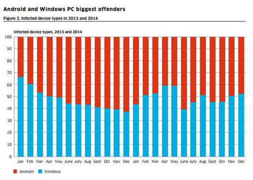2014年,恶意软件感染移动设备的数量同比增长了25%,高于2013年的20%。