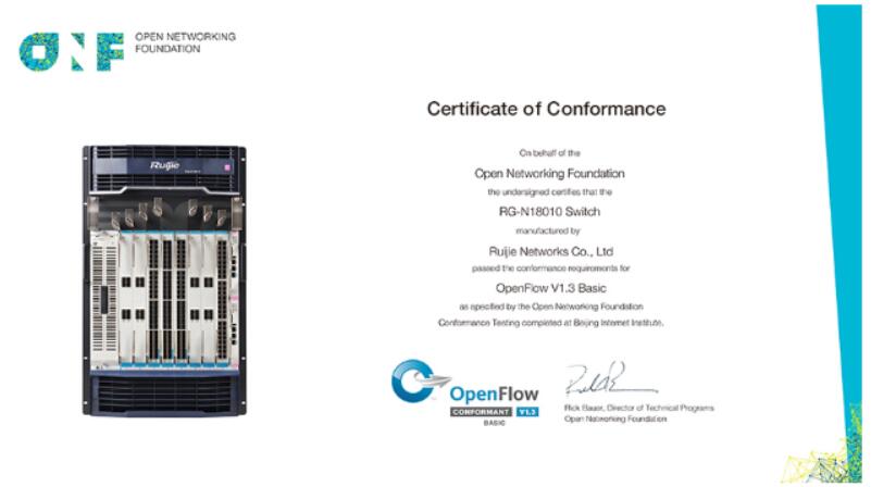 近日,锐捷网络宣布,旗下RG-N18010云架构网络核心交换机正式通过全球SDN测试认证中心的OpenFlow v1.3一致性认证测试,获得开放网络基金会颁发的一致性认证。