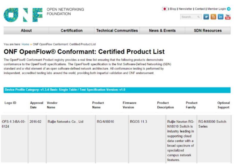 RG-N18010(Newton)通过全球SDN测试认证中心的OpenFlow v1.3一致性认证测试 开放网络基金会(ONF)官网截图 近年来,SDN技术迅速崛起,其目的是让网络变得更敏捷和灵活,从而更好地支撑数据中心内架构优化、快速响应不断变化的业务需求。与此同时,随着SDN南向接口协议标准OpenFlow市场热度持续升温,一致性认证已经得到业内的广泛认可,并逐渐成为用户采购与部署SDN技术的关键参考。 OpenFlow v1.3一致性证书是目前SDN市场中检测设备是否符合OpenFlow 标准的唯一认证证书,同时也是最高级的证书。购买带有一致性认证的设备,不仅会增加用户应用新技术信心,更可以带来部署和维护上的极大便捷。