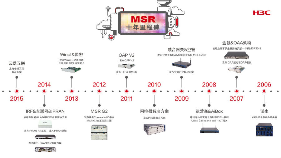 2006-MSR G1全家福 MSR产品引领路由器的全新时代 与传统路由器只是简单强调链路所不同,MSR设备集语音通信、无线接入、安全加密、以太网交换等业务于一体,能够在企业网络应用不断丰富的形势下,将多元业务方便的部署于同一节点,不仅能够最大程度的避免网络中多设备繁杂异构问题,而且极大降低了企业网络建设的初期投资与长期运维成本。由此,路由器发展也正式开启了多业务接入这一全新的时代。 近年来,融合的概念在IT基础架构领域大行其道,MSR在十年前就实现了这一点。通过强大的H3C Comware软件平台,MSR路由器实现了路由、交换、无线、安全等特性的融合,并为未来实现IT与CT的大融合打下了基础。 不仅于此,MSR路由器还通过不断的发展,对行业应用模式带来了深刻的影响。例如业界第一款路由交换一体机MSR3011E/F,集成路由、交换、安全特性,彻底改变了金融网点组网模型,使金融网点步入一体化组网时代。而2010年MSR路由器推出业界第一款开放架构平台,将CT和IT融为一体,可以方便地集成定制业务或者第三方软件。2014年业界第一款在中低端路由器上支持虚拟化(IRF2.0)解决方案在MSR路由器上成功实现,将网点网络接入路由器可靠性,再次提升一个层次。 MSR推出后,多业务路由器很快成为了整个路由器市场中的重要组成部分,并迅速获得了用户的认可。在短短十年间,在网运行设备的MSR路由器设备已近两百万台,连续10年入围四大行集采,电力调度网份额持续第一的市场份额,参与政府十二金工程中九个骨干网的承建。藉此,H3C MSR系列路由器也成为了广域网分支路由器领域的最大赢家,从2010年至今,MSR系列路由器一直排在国内同等级别路由器市场份额的首位。 从最初的单台路由器设备,到如今交付给用户全套的解决方案,MSR系列产品已经走过了一段快速发展的路程。在这一过程中,华三通信将网控器特性、OAA开放平台架构、虚拟化解决方案、场景化的云端互联解决方案等创新技术不断加入其中,使其始终领跑在同类产品的最前端。 迈过十年门槛的MSR,未来还将继续扮演重要的角色,精彩仍将继续! 新华三集团公司简介 新华三集团(简称新华三)是全球领先的新IT解决方案领导者,致力于新IT解决方案和产品的研发、生产、咨询、销售及服务,拥有H3C?品牌的全系列网络、服务器、存储、安全、超融合系统和IT管理系统等产品,能够提供大互联、大安全、云计算、大数据和IT咨询服务在内的一站式、全方位IT解决方案。同时,新华三也是HPE?品牌的服务器、存储和技术服务的中国独家提供商。 以技术创新为核心引擎,新华三40%的员工为研发人员,专利申请总量超过 6,500 件,其中 85%以上是发明专利。2015年新华三申请专利841件,平均每个工作日超过3件。 以客户需求为发展方向,新华三聚焦新IT技术领域,打造高度融合的新IT生态圈,帮助各行各业实现传统IT向新IT的融合与演进,推动全产业的转型、升级与变革。 根植中国,作为新IT的引领者和新经济的推动者,新华三长期服务于运营商、政府、金融、电力、能源、医疗、教育、交通、互联网、制造业等各行各业,将卓越的IT创新与全社会共同分享,加速社会向信息化和智慧化的迈进步伐,助推新经济快速发展。 服务全球,新华三产品已广泛应用于近百个国家和地区,尤其是欧洲和北美市场,客户包括沃达丰、西班牙电信、瑞士电信、可口可乐、梦工厂、法国国铁、俄罗斯联邦储蓄银行、三星电子、巴西世界杯等。 新华三以新IT力量引领时代变革,成就“创新共享,智慧互联”的精彩世界。