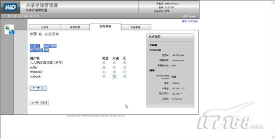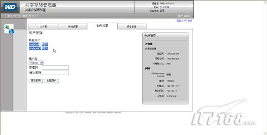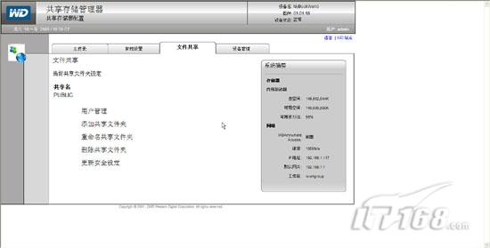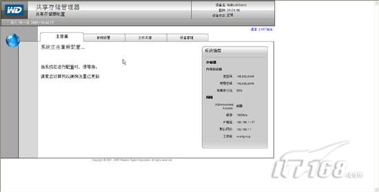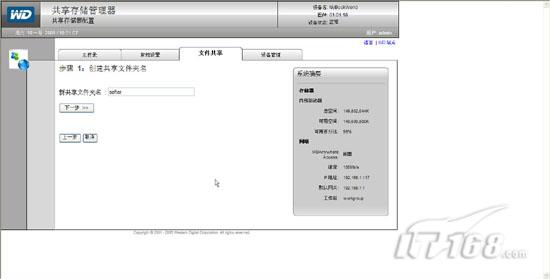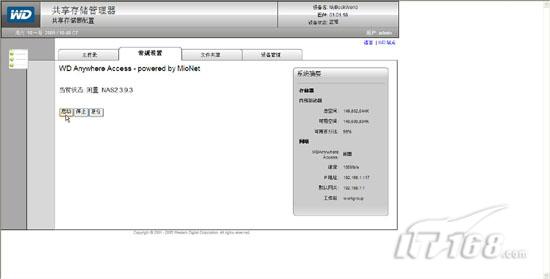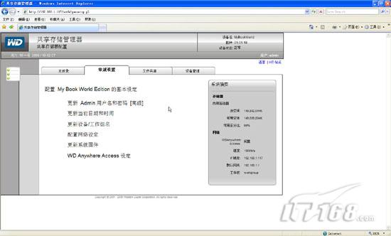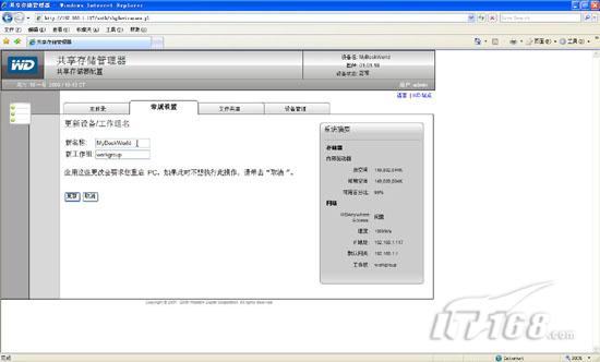 试用手记:mybookworld家用存储应用篇在“廉价家用存储系统安装篇”一文中笔者为各位IT168读者介绍了如何选择性价比非常高的WD Mybookworld II型家庭存储设备,并且讲解了如何安装存储设备操作系统,如何进行初始化操作。实际上Mybookworld不仅仅可以为我们提供数据存储,他能够实现脱机下载,RAID冗余保护数据等功能,下面笔者就来讲解下廉价家用存储系统应用方面的内容。 一,Mybookworld常规设置: 当我们通过浏览器访问Mybookworld管理界面并输入缺省用户名admin密码123456后,在管理界面的“常规设置”中我们可以针对Mybookworld的基本信息进行配置。同时在右边的系统摘要栏我们可以看到当前存储设备内部驱动器的容量大小以及网络参数相关信息。(如图1)