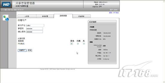 点“创建用户”按钮后输入用户名和密码即可,同时还要指定该帐户对于存储目录的访问权限,具体权限分为“无”,“只读”和“完全”,“完全”将拥有读写删除等全部最高权限。(如图9)