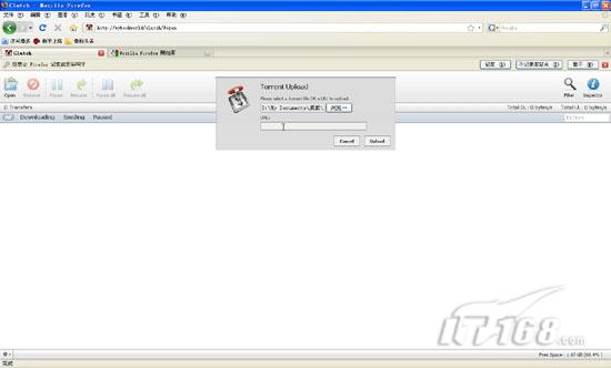 小提示: 除了默认的管理界面外mybookworld还具备SW,CLUTCH,WTORRENT等多个管理界面,两者的密码是不统一的,我们需要分开管理和设置,初始admin密码都是123456。 mybookworld主要支持MLdonkey,rtorrent两大脱机下载服务,一个对应的是电驴,另外一个就是BT,两者操作类似笔者主要介绍如何针对mybookworld进行脱机BT下载。 第一步:通过http://ip/sw的方式访问设备服务管理界面,确认BT服务是开启的。 第二步:通过火狐浏览器(IE浏览器不行)访问http://ip/clutch,之后会出现登录帐户输入信息,如果没有修改填写admin和123456即可,然后进入到WEB模式的BT下载管理界面。 第三步:点左上角的“OPEN”按钮打开种子选取窗口,在这里我们可以通过浏览按钮在本地选择一个种子文件,也可以直接指定种子URL地址,确认完毕后点UPLOAD按钮。(如图18)
