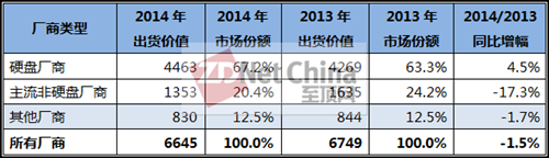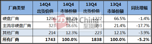 来源:2015年2月,IDC全球个人存储及入门级存储市场追踪报告 2014年第四季度全球个人和入门级存储出货价值、市场份额和同比增幅(出货价值单位:百万美元)