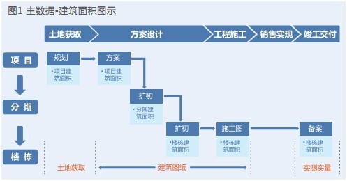 2.识别主数据范围及来源 基于主数据层级的标准,我们再来识别各层级核心维护的主数据有哪些,以及其数据来源是什么。我们需要基于主数据的三个特征去进行梳理,三者缺一不可:一是高业务价值。基于高层管理的关注视角;二是跨专业口复用。例如设计口、营销口和工程口等均需要使用;三是具有一定的生命周期。数据在项目生命周期中会动态变化。 以最通用的“建筑面积”为例,它就是一个典型的“主数据”,一方面它是高层管理报表经常会出现的一个分析维度;另一方面,设计口需要它做规划,成本口需要它做测算等等;同时,它会根据项目进展不断地动态变化。如图1所示。