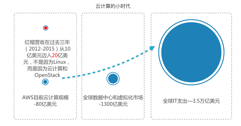 一,云计算大时代两大特征 如果说,小时代是少数创新者的颠覆式创新,大时代则是全面改变世界的起点。最直观的差别就在于,创新经济规模的急剧放大,市场参与主体的爆炸性增长。如果进一步细分,还会发现云计算的大时代至少具备以下两大特征: 1,技术路线走向开放 永远不要低估一小撮人聚集起来改变世界的力量,因为世界一直就是这么被改变的。 小时代就是有由少数人的创新带来的变道超车的机遇。十年前,亚马逊AWS仅仅是个“卖书的电商”,如今却成为全球第一大云计算企业。但这也意味着早期的创新是孤独的,没有前车之鉴,更没有经验分享,自身试错才是主要路径。 从技术角度看,这也就决定了小时代的技术路线以封闭为主。 从0到1,技术创新可以成就企业个体的迅速崛起,但是,从1到N,是技术创新的普世化渗透过程,是从技术创新到创新经济的演进过程,需要的整个产业链甚至整个社会的合力。 以创新经济学的观点,新的主导技术的颠覆力量并非取决于技术本身的性能,而取决于新技术的扩散范围和扩散速度。因此,必将有一种开放的技术力量统一云计算的大时代。 开源技术,已经成为大时代创新演进中的主导技术。 80%是个奇妙的数字,这恐怕又是二八原则的另一种体现方式。当Windows Sever抢占了服务器市场,Linux开始崛起。从1991年诞生,到如今占据服务器操作系统的80%份额,战绩只能用“完胜”二字形容。在移动互联网的世界,安卓系统也以80%的份额占据主流。