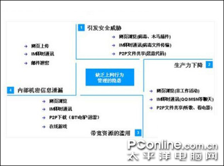 由上述现象可见,来自企业网络的内部威胁,通常都是人为因素所致,这就引出了信息安全领域的又一新发现——上网行为管理,这是信息系统安全发展史上继设备安全、数据安全之后的第三个发展阶段,此阶段的根本立足点,既不是对设备的保护,也不是对数据的加密,而是对企业员工网络行为的规范,这就提升到一个对人的管理层面的问题。