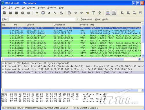 图2、Nessus 另外,还有一些开源工具也可以帮助我们实现防火墙测试,例如著名的Nmap,可以让管理员从不同的方式扫描防火墙,发现开放端口。另外人们常用的工具还有TCP/IP包分析工具hping。 3、数据包侦听 针对防火墙的另一个测试工作是判断是否有什么东西能够穿过防火墙。在测试过程中,我们可以使用一个入侵检测系统来作为报警机制。此外,数据包侦听工具可以分解数据包来看看其内部信息。 Wireshark(前身是Ethereal)就是这样一个工具,它在捕获和分析测试数据包方面非常有用。 说起Wireshark就不得不提Ethereal了,Ethereal和在Windows系统中常用的sniffer pro并称网络嗅探工具双雄,不过和sniffer pro不同的是Ethereal在Linux类系统中应用更为广泛。而Wireshark软件则是Ethereal的后续版本,他是在Ethereal被收购后推出的最新网络嗅探软件,在功能上比前身更加强大。