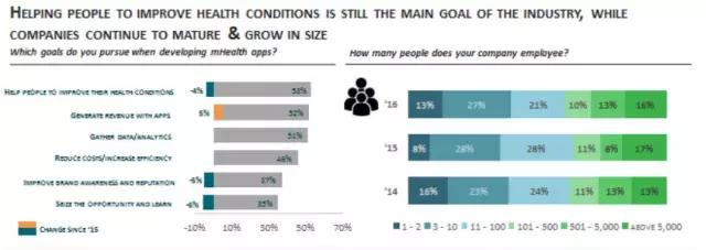 尽管非医疗行业的创业者很多,但他们的团队中均包含了大量医疗专家,85%的从业者寻求专业医疗服务,但11%的人声称其不需要专家。 小型的只包含1到2人的车库型公司数量总体有上涨趋势,从过去三年波动的8%到16%,到今年的13%, 39%公司的小型企业表明其会扩充队伍或寻求合作。当前典型公司是中等规模,拥有信息技术背景,并且有3到4年的市场经验的公司,这些研发者关注改善人们健康状况。