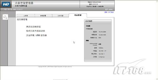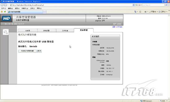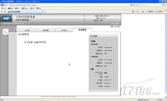 第五步:刷新后我们会看到“系统摘要”处不仅仅有内部驱动器还有外部驱动器的容量显示,两块160G的硬盘都被我们顺利添加到Mybookworld设备中,由于第一块硬盘中还安装了Debian操作系统,所以总空间容量只有150G。(如图5)