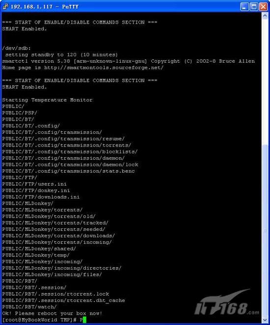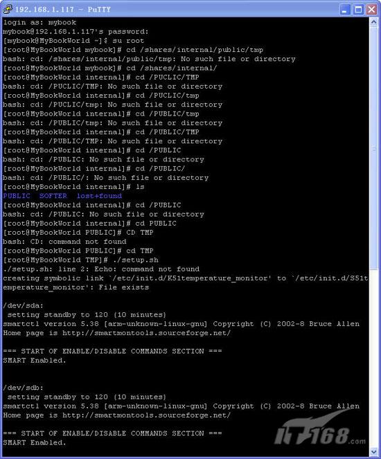 第三步:进入putty界面并连接成功后我们输入mybook作为登录帐户名,密码是123456,然后执行su root提高自身权限。接下来通过cd /shares/internal/PUBLIC/TMP命令进入TMP目录。最后执行./setup.sh开始升级补丁,出现smart enabled字样表明开始升级。(如图8)