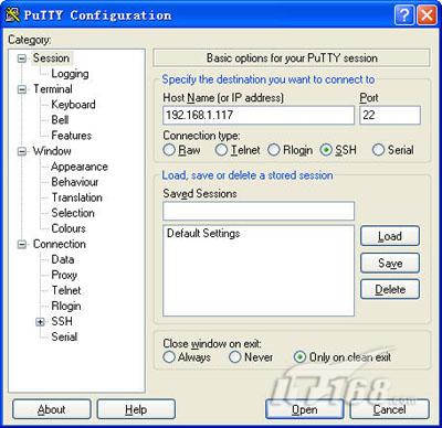 第二步:通过putty完成升级操作,目的IP地址填写mybookworld的管理地址,例如笔者的是192.168.1.117,端口为22。(如图7)