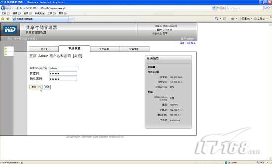 试用手记:mybookworld家用存储应用篇在“廉价家用存储系统安装篇”一文中笔者为各位IT168读者介绍了如何选择性价比非常高的WD Mybookworld II型家庭存储设备,并且讲解了如何安装存储设备操作系统,如何进行初始化操作。实际上Mybookworld不仅仅可以为我们提供数据存储,他能够实现脱机下载,RAID冗余保护数据等功能,下面笔者就来讲解下廉价家用存储系统应用方面的内容。 一,Mybookworld常规设置: 当我们通过浏览器访问Mybookworld管理界面并输入缺省用户名admin密码123456后,在管理界面的“常规设置”中我们可以针对Mybookworld的基本信息进行配置。同时在右边的系统摘要栏我们可以看到当前存储设备内部驱动器的容量大小以及网络参数相关信息。(如图1)