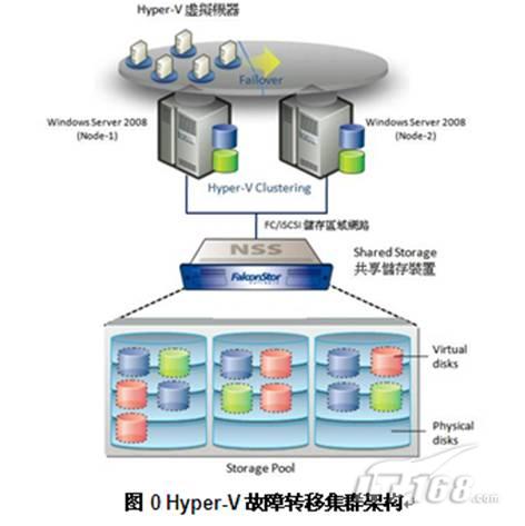 飞康:详解Hyper-V环境下的高可用集群服务器虚拟化最大的风险是“把所有鸡蛋放在同一个篮子里”,一旦服务器发生故障就可能导致大规模服务中断,在规划Hyper-V项目时,一定要将系统可用性及服务连续性纳入首要考虑因素。 相关统计数据显示,服务器整合是企业部署虚拟化的主要原因,虽然服务器整合帮助用户提升了资源利用率,同时获得了节能及集中管理等种种优势,但是也带来了极大的风险。在物理环境中,出于对稳定性和安全性的考虑,一台服务器通常只执行一个应用程序,一旦服务器发生故障,只会影响这个应用程序所提供的服务;虚拟化之后,多台应用服务器以虚拟机的形式集中在一台物理服务器上运行,虽然彼此独立,但就像“把所有鸡蛋放在同一个篮子里”,一旦发生硬件故障,所有虚拟机都会停止运行,换句话说,一台服务器故障就可能造成大规模的服务瘫痪。 服务器虚拟化厂商都很清楚虚拟化之后的风险,纷纷将缩短停机时间、确保服务器连续性的高可用性视为重点,例如VMware Virtual Infrastructure 3的HA,以及Virtual Iron V4 XEE的LiveRecovery,微软的Hyper-V当然也不例外,比较特別的是,Hyper-V的高可用性功能可与Windows Server 2008操作系统内置的故障转移集群(Failover Cluster)功能整合,在服务器发生故障时将服务迅速切换至另一台正常运行的服务器,将意外导致的非计划停机时间降到最低。 相比于其他服务器虚拟化技术提供的高可用性,Windows Server 2008 Hyper-V的故障转移集群具备以下优势: 1. 是Windows Server 2008 Enterprise/Datacenter版本的标准功能,Hyper-V被视为集群支持的服务,不需另外购买授权 Hyper-V故障转移集群的架构 在实际部署Hyper-V故障转移集群之前,首先要了解故障转移集群的架构。基本的故障转移集群的组件必需包含两台物理服务器、一台共享存储设备以及SAN环境,此架构称为2-node failover cluster(如下图0)。物理服务器必须完全兼容Windows Server 2008的64位处理器,而且强烈建议两台型号、规格完全相同的服务器。共享存储设备一般指的是FC或iSCSI介面的磁盘阵列,不过这类设备通常价格不便宜,功能与扩展性也有一定限制。近年兴起的一种称之为存储服务器(Storage Server)的共享存储设备,将行业标准服务器和存储虚拟化软件完全集成,由于其功能完整、价格合理,而且具备高扩展能力,成为不少企业构建虚拟环境存储系统的首选。
