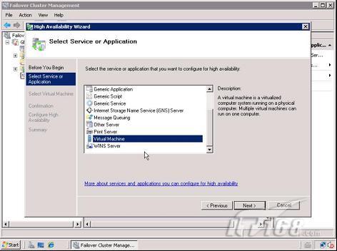 步骤5:接着就可以将Hyper-V虚拟机设定为Windows Server 2008故障转移集群所管理的服务。首先打开Hyper-V主控台,新增或复制一台虚拟机,并将虚拟机的磁盘路径指向飞康 NSS提供的共享磁盘资源。接着关闭这台虚拟机,在Failover Cluster Management内点选Configure a Service or Application,并选择Virtual Machine项。(图5)