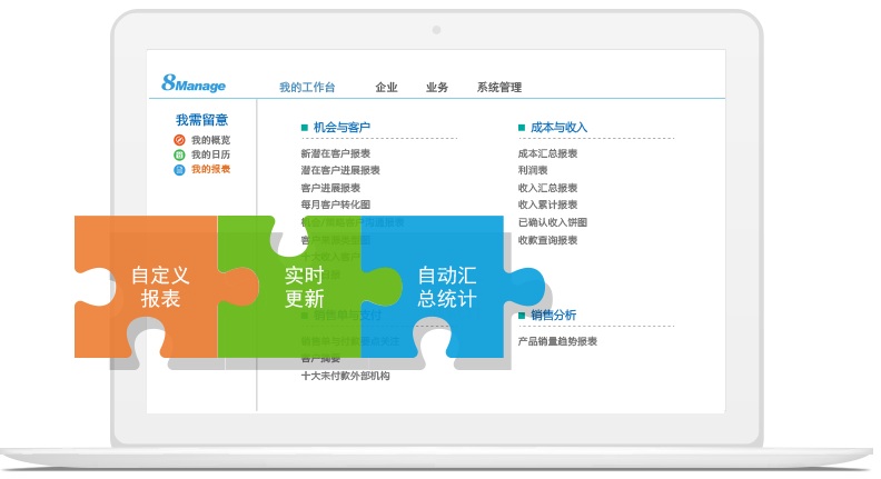 而且,一体化的系统管理,为商业智能分析保驾护航的同时,还能够促进企业内部的交流和信息共享,从而降低内部运营成本,加快运营效率。同时,8Manage CRM解决了分散式系统中数据冗余和数据不一致的问题。