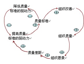 表示反向发展关系。一个具有良好“组织质量”的组织,在有利环境下,自感竞争压力降低,从而降低了对组织质量标准的要求,最终导致组织质量的下降,形成的组织质量减弱的循环回路;而组织在不利环境下,会感觉到竞争的压力,自然而然要求改善组织质量,从而提高了质量标准,形成了的组织质量增强的循环回路。通过对组织状态演变的“系统结构层次”的分析,组织状态演变的根源在于组织行为结构模式本身具有不合理性,即组织将外界环境的变化作为组织或变肥或变壮的根本原因,而没有从组织内部思考问题,倾向于“归罪于外”。
