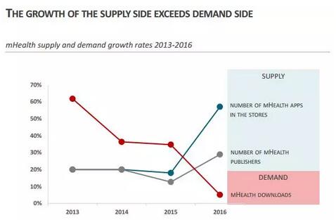 尽管移动医疗app供给者热度始终不减,但需求明显出现停滞情况,全球移动医疗app下载量在4年内翻倍,而预计在2016年将会有3.2B下载量,比2015年增加7%,这与其他app市场种类目录的下载增量呈线性关系,充分反映了便携设备的增长。
