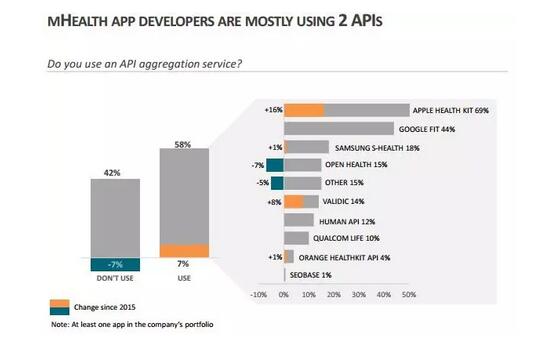 移动医疗开发者在过去几年的联系自安然更加紧密,2016年有58%的研发者选择将自己的app接入API以获得和上传数据,而这一数据在2015年仅为42%,其中接入方最流行的三大平台是苹果的HealthKit、谷歌的Fit和三星的S-Health。此外,开发者也将自己的app和其他app或传感器直接相连