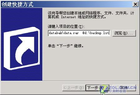 接下来,可以右击桌面,选择“新建”→“快捷方式”命令,在其中输入C:\Program Files\WinRAR\WinRAR.exe a -ep2 -ibck \\data\databak\data.rar @d:\backup.lst,即最后的命令行应为: