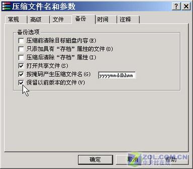 再单击“备份”标签,勾选“打开共享文件”、“按掩码产生压缩文件名”和“保留以前版本的文件”复选框(如图3)。