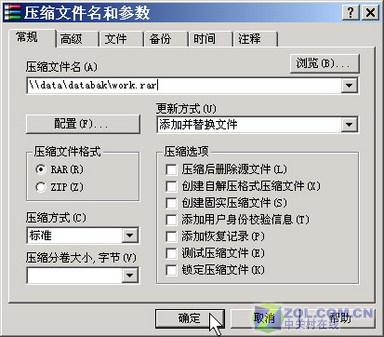 请确认你的工作文件夹,如D:\Work文件夹下的所有新文件。接着,右击Work文件夹,选择WinRAR→“添加到压缩包”命令,打开“压缩包名称和参数”窗口,再单击“常规”标签,在“压缩文件名”中输入\\data\databak\work.rar文件(如图2)。