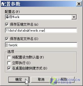 接下来,单击“配置”按钮,选择“保存当前设置为新配置”命令,在“配置名称”中输入备份方案名,如“备份Work”,同时选中“保存压缩文件名”和“保存选定文件名”及“在桌面创建快捷方式”前的复选框(如图5)。