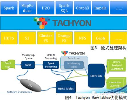 图2 程序优化后的缓存对比 第二个更推荐在大数据量下使用,有一些应用场景希望使用到内存存储空间,主要通过Tachyon来进行存储。如图3所示,这是给客户做的一个真实的案例,它是一个流式处理,是后端提供SQL查询内存数据表格,可以说是一个非常完整的处理框架。在这个过程当中,Spark-streaming的一个应用和Spark SQL的一个应用都是在同一个应用进程内,两个模块同时服务实时处理框架。 但对于真正的Service并不适合,所以如图4所示采用了Tachyon RawTables方式,把Spark Streaming放在了内存tables中,我们通过Spark SQL进程也可以访问内存数据达到即时响应的目的。同时,使得进程和进程各自工作时更加稳定,这也是它在我们真实案例中的一个使用。