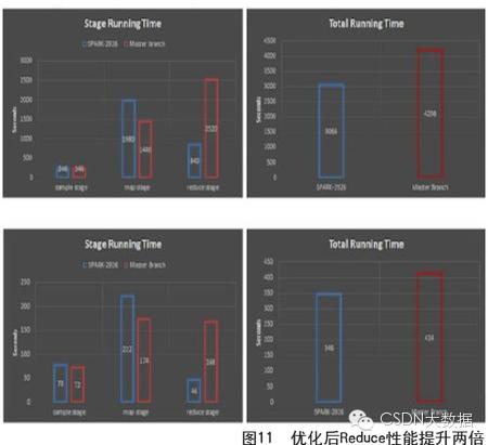 最后一点,对于Intel来说希望看到的是CPU优化,在考虑如何优化计算的同时,也希望能够优化整个软件栈来提供服务,能够充分利用平衡的一个系统。第一个例子和MapReduce Shuffle基本原理性是大同小异的。对SQL查询来说,非常依赖于Sort操作。在1.2版本里引入基于排序的Shuffle Write,解决了一些可扩展性问题。在充分利用之前的结果的基础上做了Shuffle Read,得到了最后的结果。这个工作是我们和Cloudera的工程师一起完成的,我们在内存中进行排序,然后把这些排序结果尽可能多地在内存中合并,如果内存不够则溢出,最后返回一个直接排序的数据,这样就不用浪费资源重新计算。如图11所示,分别是大、小规模数据测试结果,可以看出,通过这个优化,Reduce阶段性能会提高两倍。